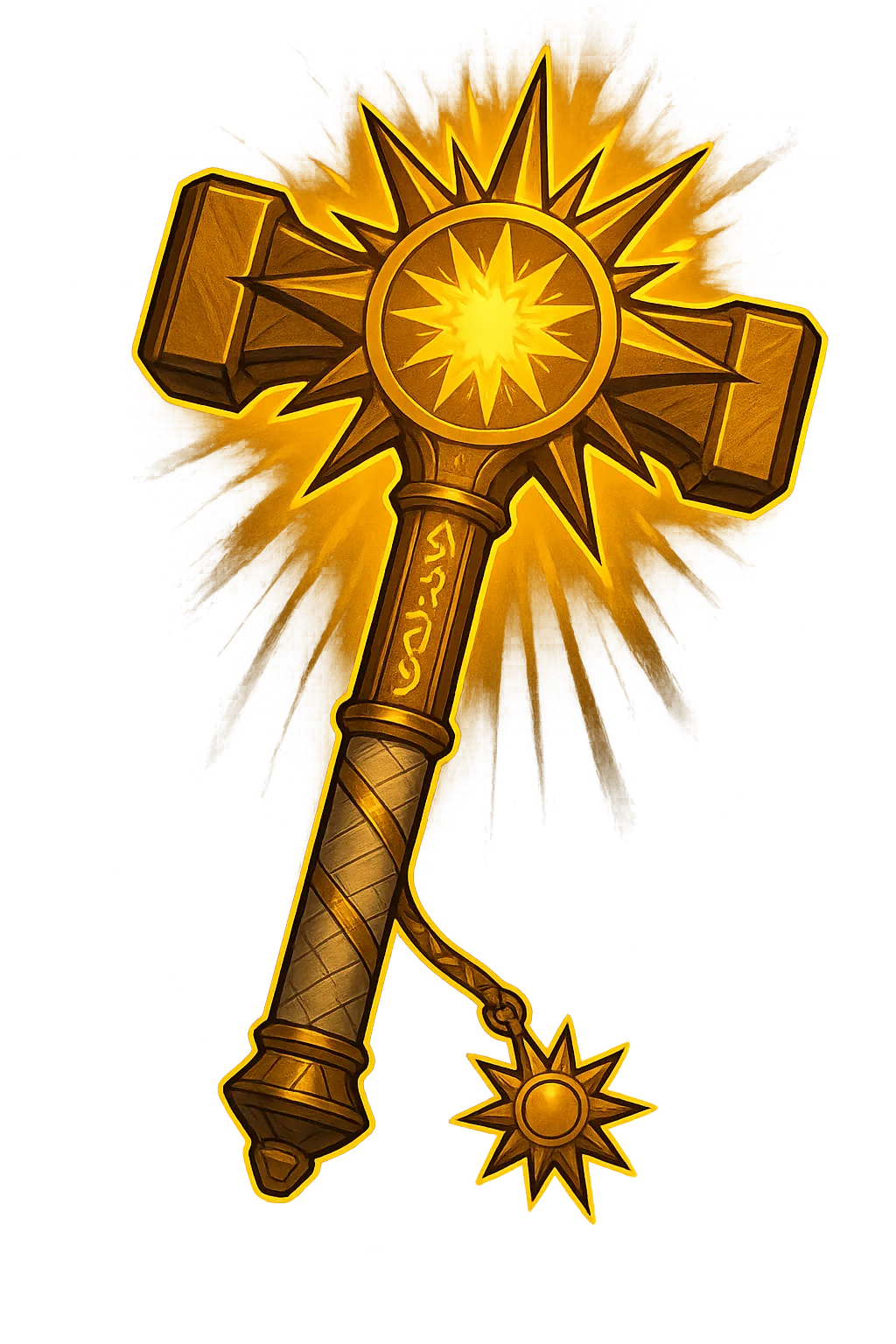 When raised, the Hammer emits a warm, steady glow that banishes shadow and deception. In battle, that glow intensifies into lances of searing radiance, burning with the resolve of its wielder. It is not merely a weapon, it is a verdict rendered in divine steel.