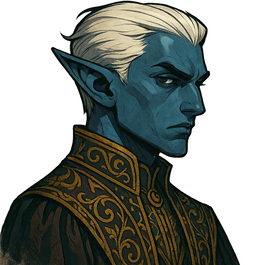 Aramoth Valdris is a young blue-skinned mountain elf with slicked-back white hair and cold, calculating eyes. He carries himself with an arrogant bearing that speaks to his wealthy upbringing, and his student robes are noticeably finer than those of his peers—embroidered with gold thread and made of expensive fabrics. His expression often carries a hint of disdain for those he considers beneath him.