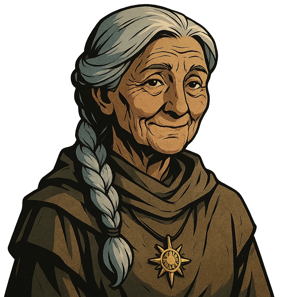 Cherylcoles is an elderly human woman with kind eyes and silver hair worn in a simple braid. Her face is lined with age but softened by a gentle, knowing smile. She wears the plain vestments of an abbess—unadorned but dignified—and moves with the careful grace of someone who has spent a lifetime in contemplation and service. A small pendant of Elandria’s sunburst hangs at her throat.