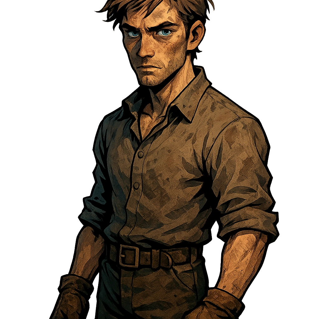 Gareth Voss is a young man in his late twenties with tousled brown hair and alert blue eyes that rarely stay still for long. Though still in his prime, there’s a tired edge to his expression—a shadow of someone who’s seen more than his years should allow. His lean frame and quick, practiced movements hint at a life spent on the run or in tight spots. He wears practical work clothes—a miner’s shirt, worn gloves, and heavy boots—that let him blend easily among Southaven’s laborers, but there’s a restless sharpness to him that doesn’t quite fit the part.