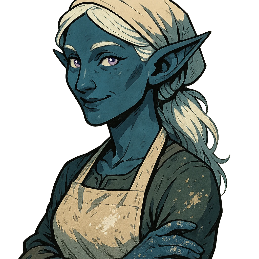 Miraen is a blue-skinned mountain elf with pale violet eyes and white hair often pinned back beneath a cloth cap. Her hands move with practiced efficiency, shaping dough and decorating pastries with the precision of decades of experience. Despite the early mornings and long hours, her expression is always warm and welcoming.