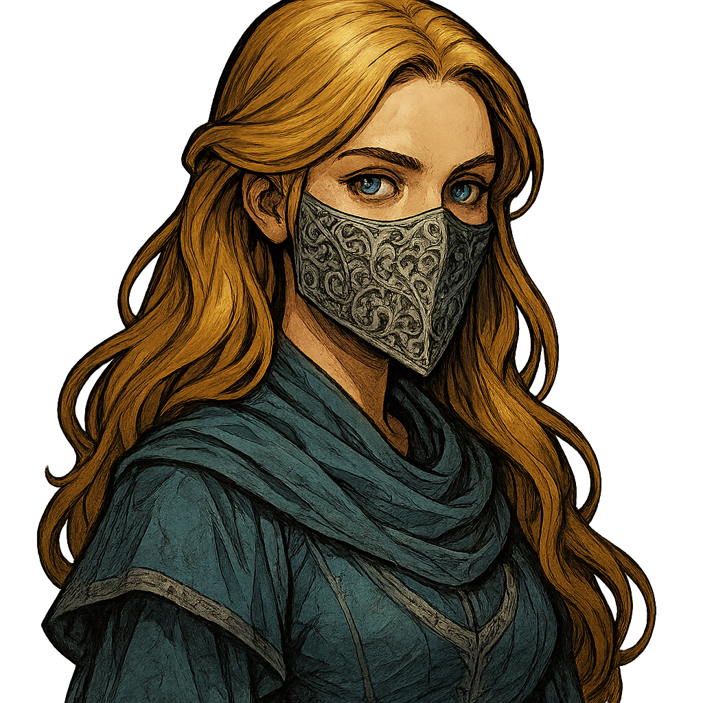 Princess Mariella Solborn is a composed woman in her late twenties with the golden hair and blue eyes of the Solborn line, though her features carry a softness her father’s never had. Since moving to Sunset Bluff, she has adopted the Thornbrook court’s humility laws and wears an ornate silver veil over the lower half of her face in public. She dresses in the muted blues and silvers favored by the coastal nobility rather than the whites and golds of Solaris.