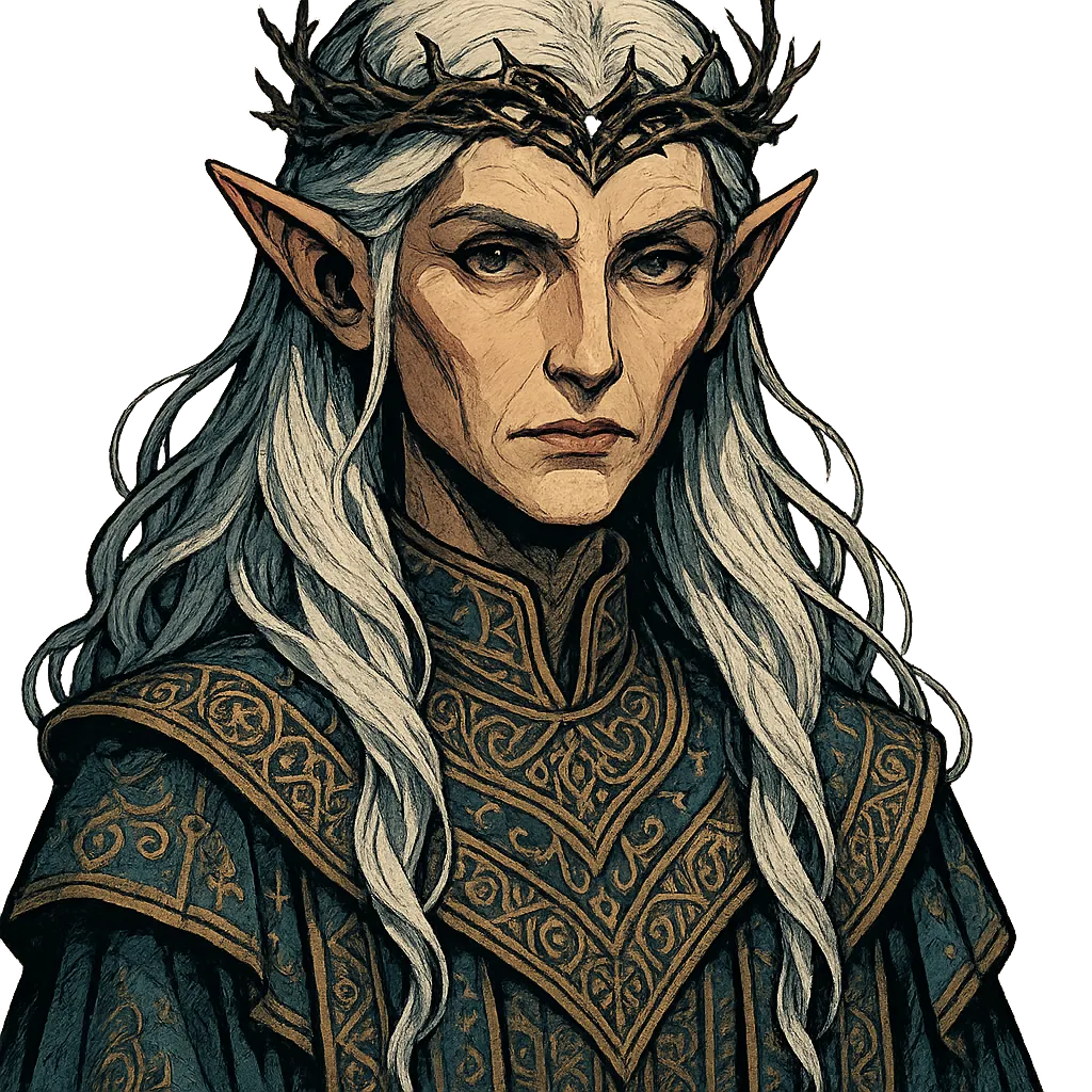 Queen Sylanthiel of Vel Enweir is an ancient elven monarch whose presence radiates timeless authority. Her silver hair flows like moonlight, and her eyes—cool, sharp, and unblinking—seem to see beyond the present moment. She wears a circlet of woven branches and starlight, and her ceremonial robes are embroidered with sigils of protection and memory. Though she rarely raises her voice, it carries the weight of centuries.