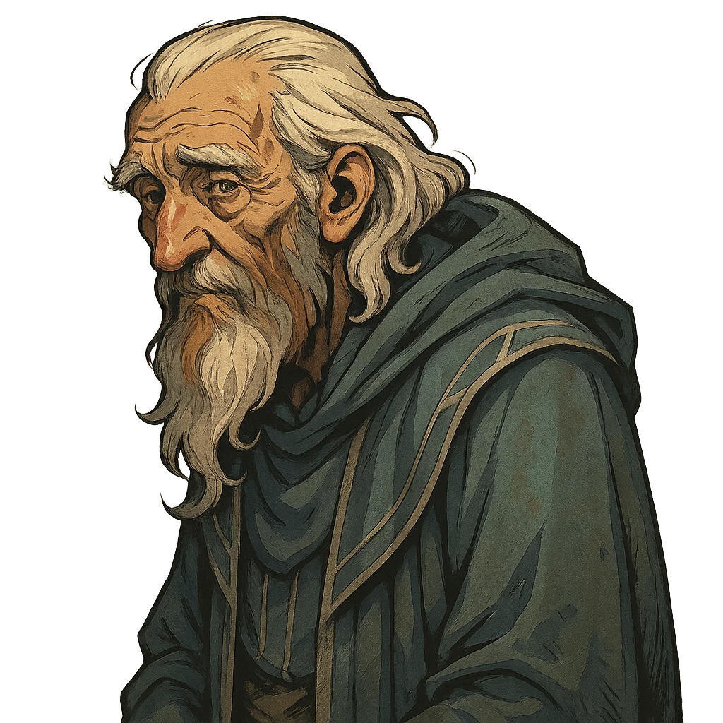 Rayvencoles is an elderly human man with a weathered face carved by decades of mountain winds. His hair, once golden-brown like his son’s, has faded to silver-white, and his beard is long and streaked with gray. Though age has stooped his shoulders, his green eyes remain sharp and warm. He wears the simple robes of a Lightbearer, faded from years of use but kept immaculately clean.