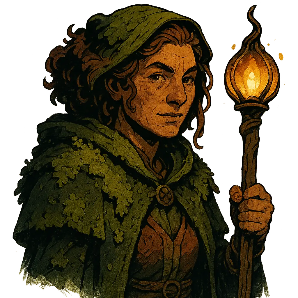 Sylvara Greenthorn appears as a warm, earth-touched representative of the old groves. Her robes are patched with living moss, and her staff is topped with a glowing seedpod said to pulse with Faeren’s will. She laughs easily, eats heartily, and knows the names of every street vendor in Balandel. The city’s people love her.