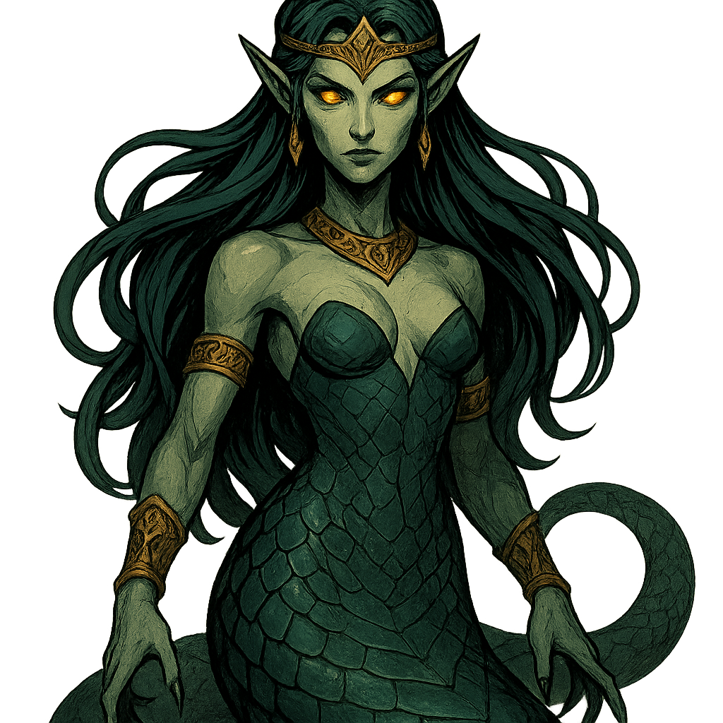 Sythara is an ancient and powerful being—a massive serpent with the upper body of an elven woman, scales of deep jade green, and eyes like molten gold. Her voice echoes from everywhere at once, cold and sibilant, and her presence fills any space with an oppressive weight.