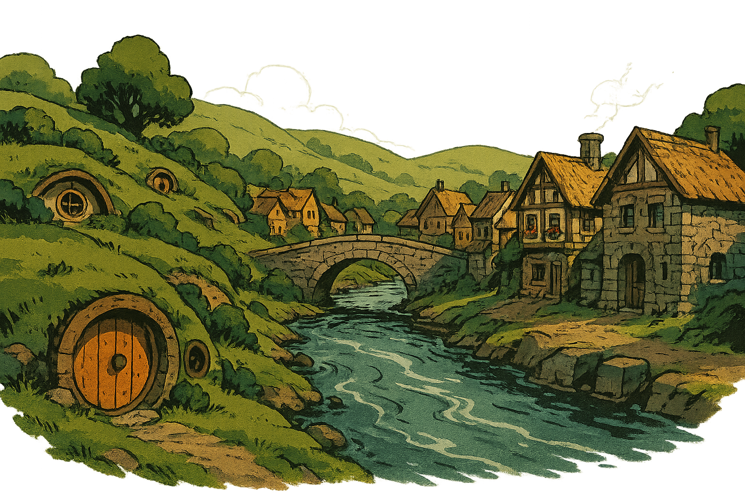 Cobblefoot is a modest halfling village situated along the River Elryn, about 30 miles southwest of Clover. Unlike the purely halfling settlements to the north, Cobblefoot is home to a small but growing population of humans and dwarves who left the bustle of cities like Solaris and Southaven in search of a simpler, more peaceful life. The village features a mix of architectural styles: traditional halfling round-door homes built into hillsides sit alongside sturdy human cottages and dwarven stone workshops. A single stone bridge arches gracefully over the river, connecting the village’s two halves, and the air is filled with the sounds of hammering, baking, and the gentle rush of water.