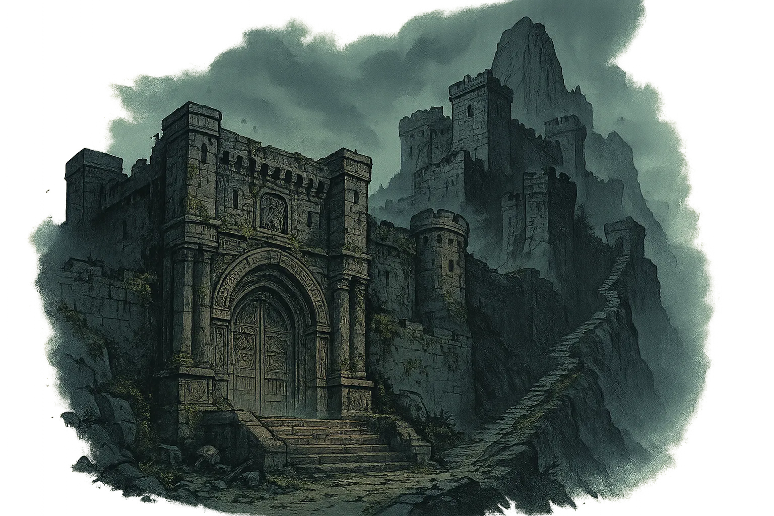 Duskwatch, once known as Valengarde Citadel, stands as a forgotten sentinel in the heart of the Pale Mountains. This ancient keep’s front gates stand ominously at the base of Valengarde mountain with rocky cliffs, a ghostly reminder of its former glory as a thriving mithril mine. The citadel was a marvel of engineering, built into the mountain itself, featuring a grand entrance flanked by high stone walls and fortified towers that jut out precariously from the mountain face.
