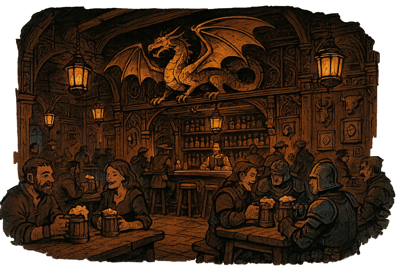The Gilded Dragon is a raucous tavern in Solaris’s trade quarter, famous for its dark ales and the nightly competitions of drinking, dice, and storytelling. The common room is warm and loud, filled with the clatter of mugs and the rumble of boisterous laughter. A carved wooden dragon, scales painted gold, coils above the bar with a perpetually smug expression. The walls are lined with trophies from legendary drinking contests and framed dice believed to be lucky.