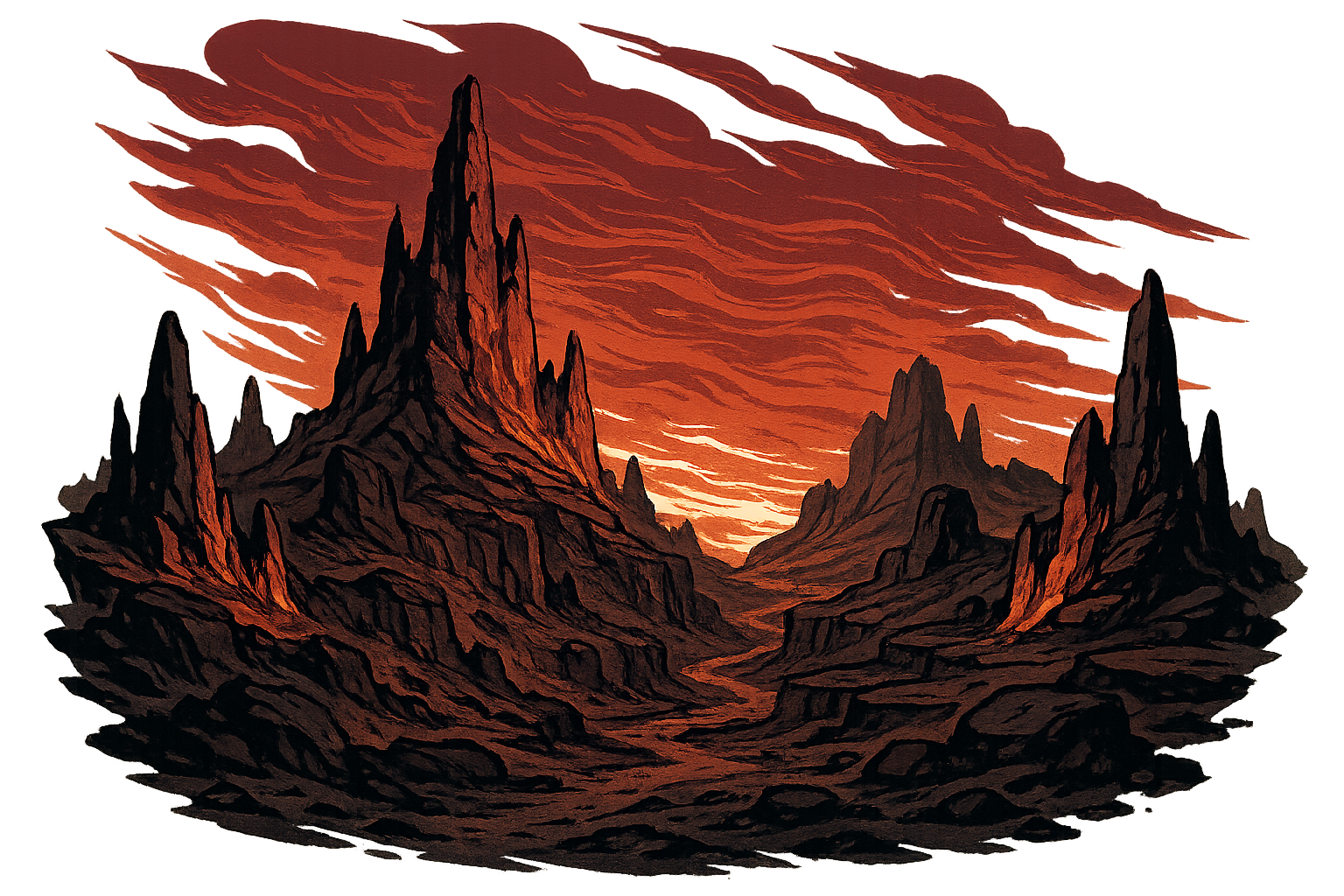 The Hellrock Hills rise west of Southaven like a labyrinth of stone, a sprawling maze of towering brown Metamorphosed volcanic rock and biotite monzogranite formations weathered into twisted spires, narrow passages, and hidden canyons. The hills earned their name from the ruddy, iron-rich stone that glows like smoldering embers in the light of dawn and dusk, and from the treacherous paths that wind through their depths—easy to enter, difficult to escape. Wind howls through the stone corridors with an eerie wail, and the terrain shifts from sun-baked plateaus to shadowed ravines where even experienced scouts can lose their way.