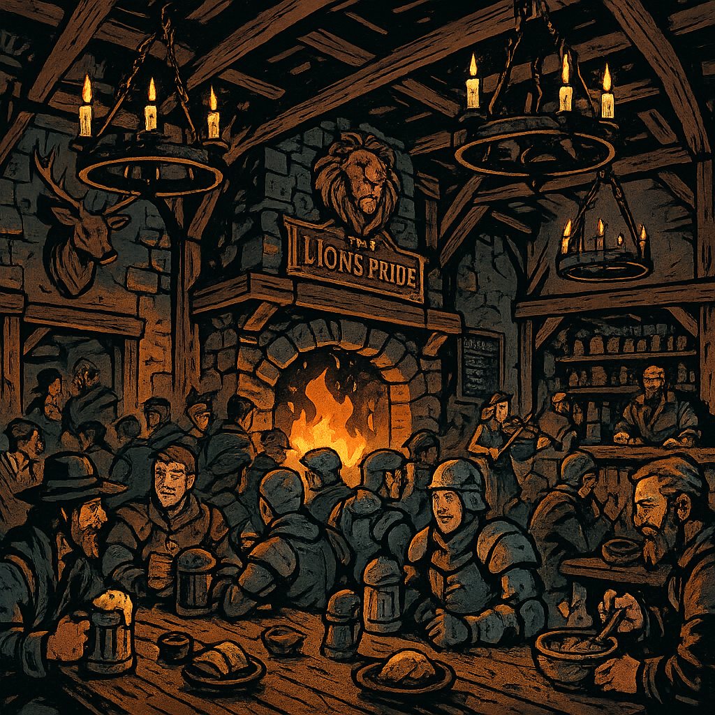 The Lion’s Pride Inn is the heart of Last Light, a two-story timber-framed building on the town’s central square with a carved wooden lion rampant mounted above the front door, its paint faded but its posture defiant. Inside, the common room is warm and crowded most evenings, lit by a large stone hearth and dozens of tallow candles dripping wax onto iron chandeliers. Long oak tables fill the floor, scarred by years of knife games, spilled drinks, and arm-wrestling matches. A fiddler plays most nights, and the regulars, mostly Witchguard soldiers and their families, sing along to old marching songs whether they know the words or not.