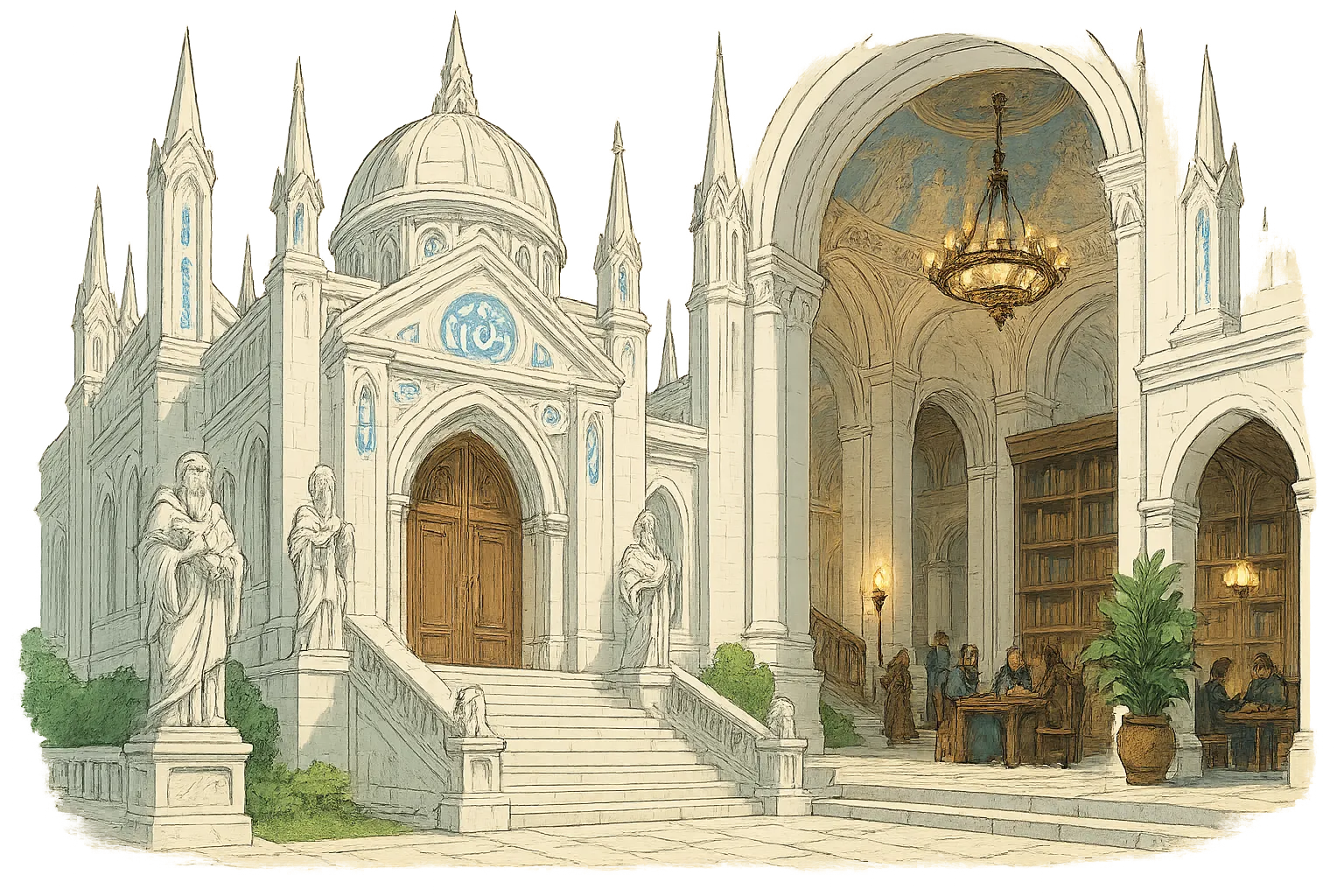 - The Sapphire Temple: the spiritual center of Lusteris, serving as a place of worship, healing, and divine guidance. The temple is not dedicated to a single deity but rather to a pantheon of gods and goddesses who are revered by the people of the city.