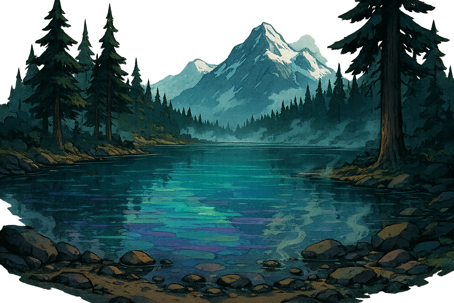 Opal Lake is a pristine mountain lake nestled high in the Dragonspire Mountains, just north of Brandyburrow. Its waters shimmer with an iridescent quality—shifting between blues, greens, and subtle purples depending on the light and angle—which earned it the name “Opal.” Fed by snowmelt and mountain springs, the lake’s waters are crystal-clear and icy cold, so pure that you can see straight to the rocky bottom even in its deepest parts. Ancient pines ring the shoreline, and mist often clings to the surface at dawn, creating an ethereal atmosphere that feels almost otherworldly. The lake serves as the primary source for the River Elryn, which flows down from the mountains to nourish the halfling settlements below.