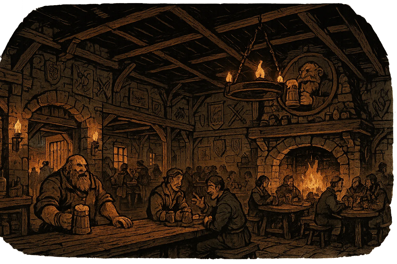 The tavern’s exterior is built of sturdy timber and stone, its large oak doors flanked by iron sconces that glow warmly in the evening. A massive iron belly-shaped sign, engraved with the likeness of a laughing dwarf and a foaming mug, swings gently in the wind. Inside, the air is thick with the scent of roasting meats, spiced ale, and the rich, smoky aroma of dwarven whiskey. Thick wooden beams line the ceiling, and the walls are adorned with old maps, mounted weapons, and faded banners - tokens of Rusty’s past adventures and gifts from the many patrons who have passed through his doors.