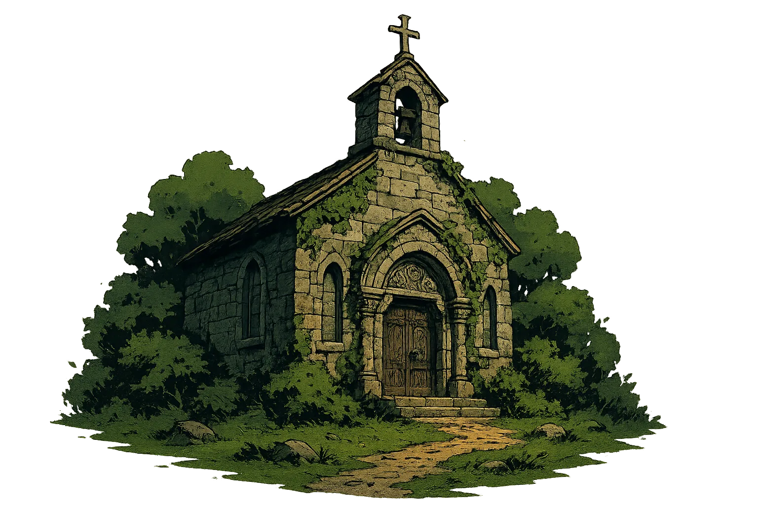 A small, humble chapel to Elandria, the Lady of Light, Saint Andral’s sits a few hours ride outside of Balandel just outside of Vel Enweir, the Queen’s holy realm. Its single nave is narrow, with worn oak pews and walls whitewashed but cracked in places. A pair of tall, simple windows let in pale light, and the only ornament of note is a carved sunburst above the modest altar. A faint smell of smoke and bread lingers — from the tiny kitchen hearth just behind the sanctuary, where the priest cooks both his meals and the offerings of the faithful.