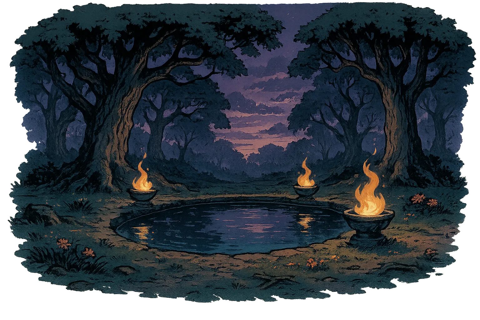 Mirror-pools and crystalline springs dot this high, wind-swept grove, where the air always smells faintly of ash and rain. The flames that burn here, often in floating lanterns or sacred braziers, are not wild but deeply meditative, tended with reverence. Telor’Augus represents cleansing, transformation, and the pain required for true change. Many druids come here alone, seeking visions in the reflection of water and flame alike. It is a place where ego burns away.