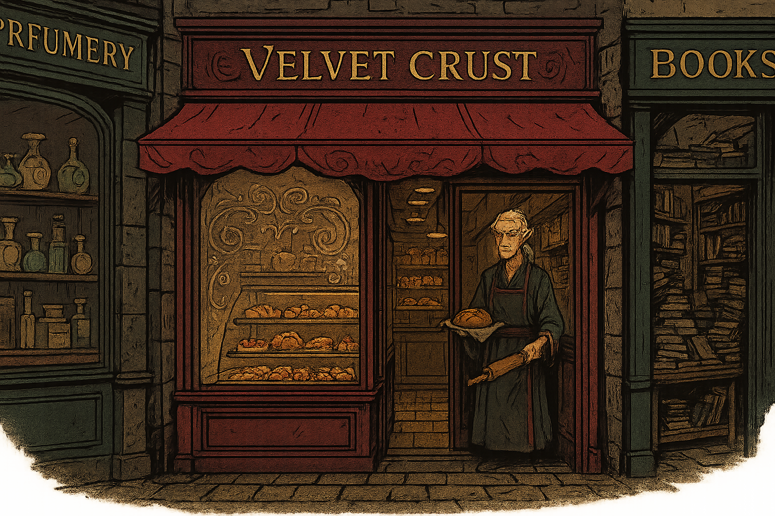 Tucked between a perfumery and a bookshop that refuses to alphabetize, The Velvet Crust is a narrow little patisserie with deep red awnings and frosted-glass windows etched in swirling, floury runes. The smell—warm butter, plum jam, and just a hint of thyme—wraps around you like a velvet cloak the moment you step inside.
